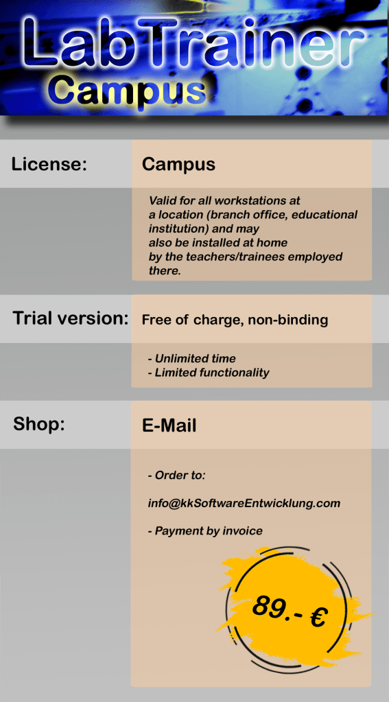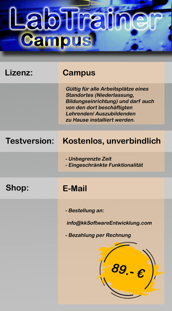Für die Nutzung des LabTrainers wird ein PC mit Windows 10 oder Windows 11 benötigt. Die Software setzt das Microsoft .NET Framework 4.8 voraus, welches in aktuellen Windows-Versionen bereits standardmäßig enthalten ist. Für eine optimale Darstellung der Übungen ist eine Bildschirmauflösung von mindestens 1440×900 Pixeln erforderlich. Für die Installation sollten ca. 800 MB freier Festplattenspeicher eingeplant werden.